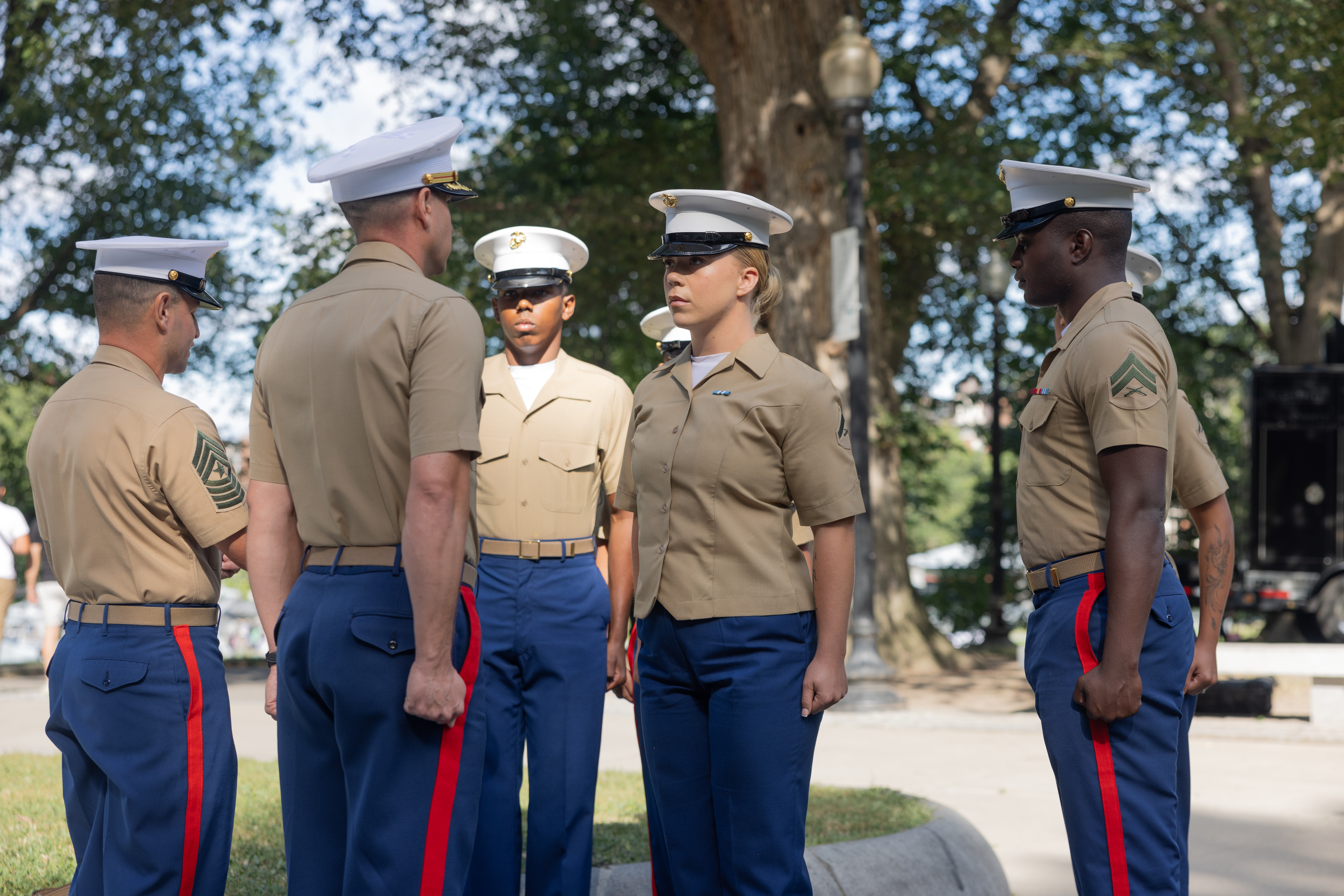 BOSTON, Mass. - U.S. Marine Corps Lance Cpl. Olivia Goodnight, a motor vehicle operator assigned to Special Purpose Marine Air-Ground Task Force-250, receives the Navy Achievement Medal at the Soldiers and Sailors Monument during Marine Week Boston, Aug. 24, 2025. Marines and Sailors are awarded a NAM based on performance or achievements within their unit. Marines stationed across the globe commemorate the 250th anniversary of the Marine Corps, honoring a distinguished legacy of service, sacrifice, and unwavering fidelity to both the nation and fellow Marines. (U.S. Marine Corps photo by Cpl. Anakin Smith)